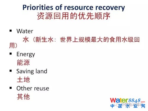 資源回收的優(yōu)先順序:作為一個(gè)很小的缺乏天然資源的城市國家,新加坡把資源回收作為放在很重要的地位,像大家知道由于天然的水資源的短缺,水的回收放在第一位,現(xiàn)有的150萬噸的污水處理,一半以上的出水用雙模技術(shù)生產(chǎn)新生水。而到2025年的時(shí)候,除初期雨水外,其余的出水做飲用水級(jí)的再應(yīng)用。