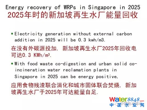 到2025年的時(shí)候,新加坡再生水廠的能源回收在沒有外加碳源的情況下可以達(dá)到0.3千瓦時(shí)每立方米污水。應(yīng)用食物殘?jiān)统鞘泄腆w廢棄物的協(xié)同焚燒,整個(gè)新加坡污水處理廠包括新生水廠可以達(dá)到能源自給,從而實(shí)現(xiàn)新加坡污水能源回收的第三版。