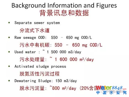 當(dāng)我們談污泥污水回收的時(shí)候要介紹一下背景,在新加坡污水處理是分流系統(tǒng),有機(jī)碳是550-650,新加坡華人占人口約75%,飲食習(xí)慣和大陸沒有區(qū)別。但是污水的COD的含量是在正常水平。污水處理量目前是160萬噸,污水處理主要是應(yīng)用脫氮活性污泥工藝,污泥每天約800立方米,20%的含固量。