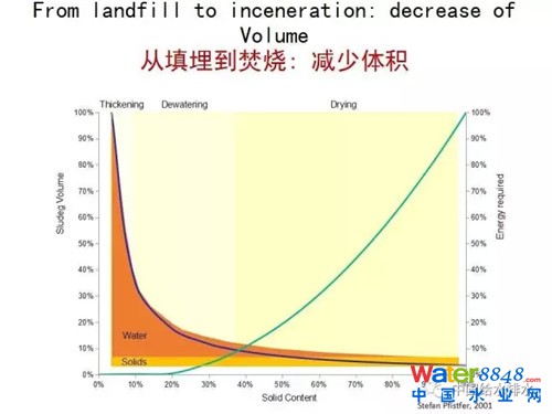 (詳見PPT)這張圖就顯示干化率、污泥體積和能源的需求關(guān)系,新加坡最早是脫水達(dá)到20%含固率以后就進(jìn)行的土地的填埋,但是沒有多久就填滿填埋場(chǎng)了,所以現(xiàn)在進(jìn)行焚燒處置。據(jù)我所知,在北歐許多國家焚燒是最后處置方法。當(dāng)然北京、上海最后怎么樣做?我們眼前下結(jié)論還為時(shí)尚早。