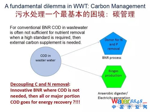 到2025年新加坡三個(gè)水廠建成的時(shí)候,能量回收的情況如何呢?污水處理最大的困境就是碳的管理,本身讓碳源要用來去除營養(yǎng)物又產(chǎn)能源的時(shí)候,是很難兩全其美的,這就是我們現(xiàn)在要談主流厭氧氨氧化的問題。未來處理廠的概念,如果這概念廠能實(shí)現(xiàn),今后的處理廠可可以把盡量多的碳拿下來送到厭氧消化里面去產(chǎn)生能源。但是條件是什么呢?后面的營養(yǎng)物的去除不需要碳源,或者是需要的很少,這就提供了一種能源平衡和剩余的可能性。比如說我們先的現(xiàn)在的初沉池碳去除是40%,你就可以增長到60%,相當(dāng)于50%能源的增加。