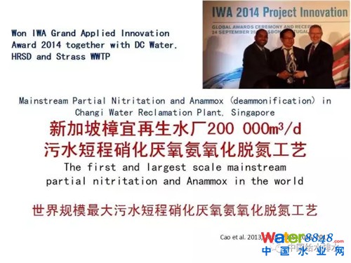 (詳見PPT)目前新加坡樟宜再生水廠,20萬噸的主流厭氧消化過程已經(jīng)報(bào)告了,是世界上最大的部分短程氨氧化和氨厭氧化過程,并且在2014年,我們跟美國的兩家水務(wù)系統(tǒng)和Strass廢水處理廠一起贏得了國際水協(xié)的發(fā)明大獎(jiǎng)。