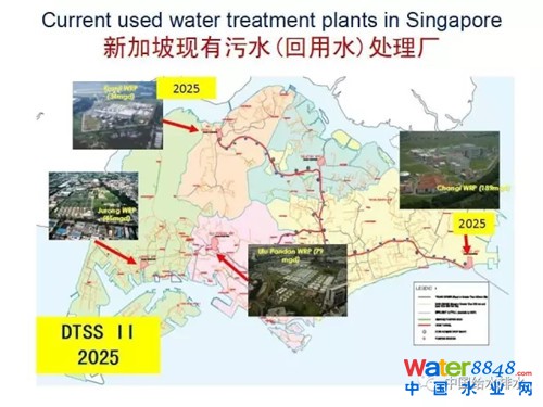 (詳見PPT)新加坡現(xiàn)有4個(gè)污水處理廠,總處理量是160萬噸。三個(gè)紅塊稱之為第二階段的污水處理廠。這兩個(gè)現(xiàn)有污水處理廠在新廠建成以后就要廢除了,到2025年新加坡會(huì)就有三個(gè)污水處理廠,總處理量到時(shí)候是240萬立方米/天。