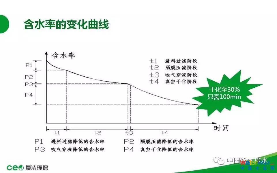 低溫真空脫水干化成套技術(shù)主要是針對含固率比較高的或者含水率比較低的物料的固液分離,實(shí)現(xiàn)脫水干化一體化,減少了污泥在脫水和干化這兩個工藝之間的一些轉(zhuǎn)換,包括一個時間的轉(zhuǎn)換,包括空間的轉(zhuǎn)換,在這個轉(zhuǎn)換過程中,也會降低對環(huán)保上,包括安全上的一些壓力。采用機(jī)械脫水以后,機(jī)械脫水有一個極限,脫到含水率80、7060,機(jī)械脫水無法再降低,我們再用低溫真空干化的原理,使污泥達(dá)到傳統(tǒng)熱力干化的脫水效果。可以實(shí)現(xiàn)污泥處理含水率10-60%可調(diào)。這是一個壓力和水沸點(diǎn)的曲線。右側(cè)是一個標(biāo)準(zhǔn)大氣壓下水的沸點(diǎn)是一百度,我們的低溫真空的概念,通過抽真空使泥餅中的水分在40-50度時沸騰汽化。這是整個工藝流程的四個階段:進(jìn)料過濾,隔膜壓濾,吹氣穿流,真空干化。