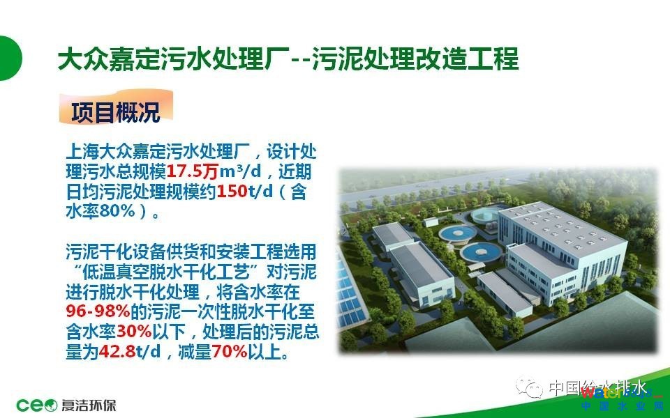 下面我介紹一個近期的工程案例。大眾嘉定污水處理廠:這是上海大眾嘉定BOT運(yùn)行的污水處理廠,污水廠的設(shè)計污水處理規(guī)模是17.5萬噸,分三期建設(shè),現(xiàn)在三期已經(jīng)建設(shè)完成了。近期的污泥處理規(guī)模是150噸,就是17.5萬噸的水,150噸的泥,污泥干化設(shè)備的供貨安裝,這是一個標(biāo)段,采用低溫真空脫水干化工藝,原泥96-98%一次性脫水干化至含水率30%以下,處理以后的污泥總量理論計算是42.8噸,減量71%左右。