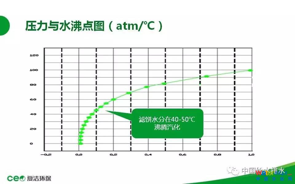 低溫真空脫水干化成套技術(shù)主要是針對含固率比較高的或者含水率比較低的物料的固液分離,實(shí)現(xiàn)脫水干化一體化,減少了污泥在脫水和干化這兩個工藝之間的一些轉(zhuǎn)換,包括一個時間的轉(zhuǎn)換,包括空間的轉(zhuǎn)換,在這個轉(zhuǎn)換過程中,也會降低對環(huán)保上,包括安全上的一些壓力。采用機(jī)械脫水以后,機(jī)械脫水有一個極限,脫到含水率80、70、60,機(jī)械脫水無法再降低,我們再用低溫真空干化的原理,使污泥達(dá)到傳統(tǒng)熱力干化的脫水效果?梢詫(shí)現(xiàn)污泥處理含水率10-60%可調(diào)。這是一個壓力和水沸點(diǎn)的曲線。右側(cè)是一個標(biāo)準(zhǔn)大氣壓下水的沸點(diǎn)是一百度,我們的低溫真空的概念,通過抽真空使泥餅中的水分在40-50度時沸騰汽化。這是整個工藝流程的四個階段:進(jìn)料過濾,隔膜壓濾,吹氣穿流,真空干化。