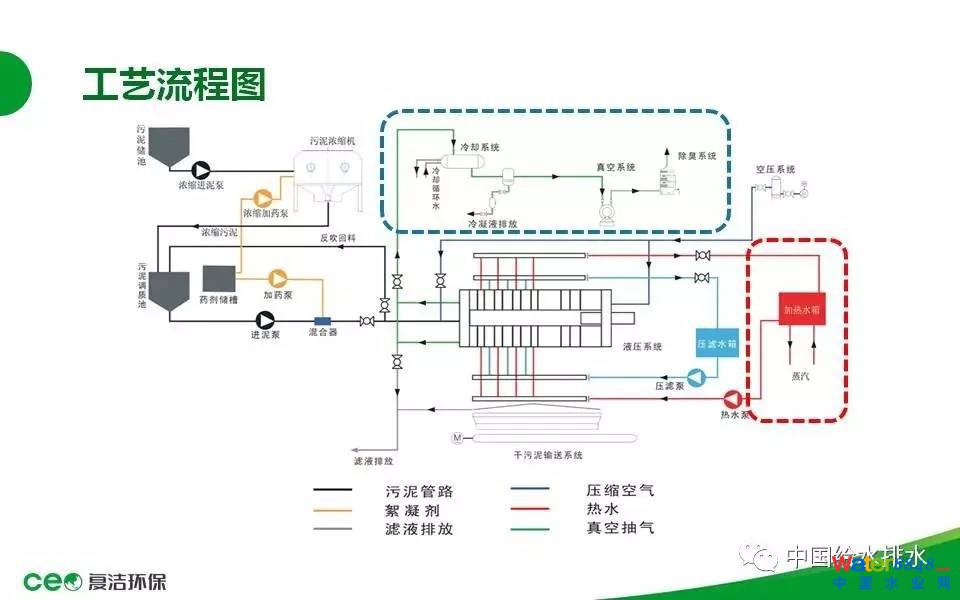 再增加一個系統(tǒng)就是真空系統(tǒng),污泥中的水分常壓下需要一百度以上才能沸騰汽化。熱源只有80度左右,所以提供一個低壓的環(huán)境,就是增加一個真空環(huán)境。這個技術(shù)集合脫水和干化一體化,從源頭進(jìn)行減量,避免污泥的大量外運(yùn),包括降低了一些外運(yùn)過程中的環(huán)境污染等等。那我們也是采用模塊化的設(shè)計,根據(jù)項(xiàng)目建設(shè)的規(guī)模包括進(jìn)度,一次性設(shè)計、靈活分期建設(shè),后面有一些案例可以體現(xiàn)這一點(diǎn)。因?yàn)樗撍苫癁橐惑w,直接運(yùn)行成本更加低廉,;只添加少量常規(guī)的絮凝劑,藥劑成本低。熱源,我們采用熱水作為熱源,在項(xiàng)目建設(shè)階段,可以多途徑的去選擇熱源的組成,可以選擇低品位的余熱蒸汽,煙道氣,或者配置天然氣的鍋爐等等。
