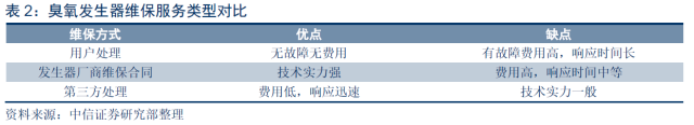 質(zhì)保期后的維保服務(wù)市場(chǎng)目前較混亂。臭氧發(fā)生系統(tǒng)的質(zhì)保期通常為1~3年不等,質(zhì)保期后的維保服務(wù)目前有三種類型:用戶處理、發(fā)生器廠商處理、第三方處理。