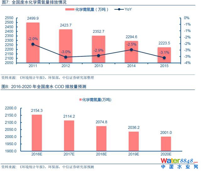 根據(jù)環(huán)保部《環(huán)境統(tǒng)計(jì)年報(bào)》,2015年COD排放量 2223.5萬(wàn)噸。2017年1月5日,國(guó)務(wù)院印發(fā)《“十三五”節(jié)能減排綜合工作方案》,指出到2020年,全國(guó)污水年COD排放總量控制目標(biāo)為不超過(guò)2001萬(wàn)噸。依據(jù)2011-2015減排趨勢(shì),我們估算出2016-2020年COD排放量。