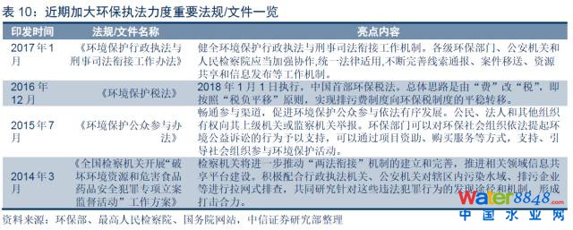 環(huán)保執(zhí)法進(jìn)一步加強(qiáng)。2013年,國(guó)務(wù)院發(fā)布“大氣十條”,對(duì)重點(diǎn)行業(yè)脫硝、揮發(fā)性有機(jī)物污染治理提出明確要求。2015年,國(guó)務(wù)院發(fā)布“水十條”,對(duì)紙漿漂白、重點(diǎn)流域化學(xué)需氧量排放、近岸流域總氮排放等提出嚴(yán)格要求。此外,近年來(lái)各項(xiàng)加強(qiáng)環(huán)保執(zhí)法的法規(guī)、文件紛紛出臺(tái),從制度層面對(duì)排污企業(yè)形成了更嚴(yán)厲的約束。