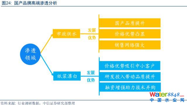 國(guó)產(chǎn)品牌進(jìn)入市政供水市場(chǎng)。供水深度處理,因?yàn)樯婕帮嬘盟踩,各地政府重視度高,通常選用穩(wěn)定性好的外資品牌產(chǎn)品。但近年來(lái),國(guó)產(chǎn)品牌也開(kāi)始滲透這一領(lǐng)域。究其原因,主要有以下幾個(gè)方面:1)國(guó)產(chǎn)品質(zhì)提升,跨越供水處理要求門檻;2)深度處理由發(fā)達(dá)地區(qū)向欠發(fā)達(dá)地區(qū)推廣,客戶價(jià)格敏感度提高;3)借助強(qiáng)大的銷售渠道網(wǎng)絡(luò),國(guó)產(chǎn)深度處理業(yè)績(jī)?cè)龆,為進(jìn)一步擴(kuò)張?zhí)峁╉?xiàng)目佐證。