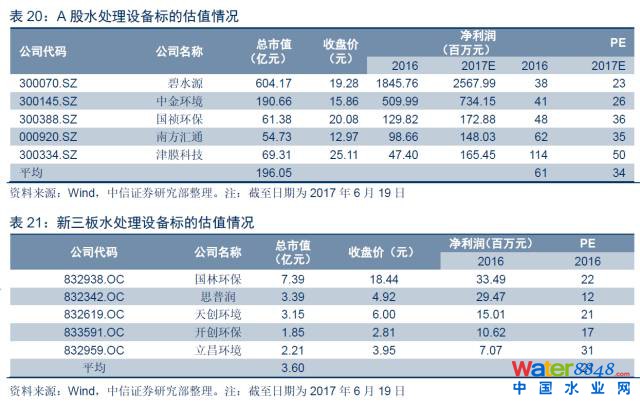 對(duì)比A股與新三板水處理設(shè)備相關(guān)標(biāo)的的估值情況,截至2017年6月19日:(1)A股相關(guān)標(biāo)的2016/2017PE均值為61X/35X;(2)新三板相關(guān)標(biāo)的2016年P(guān)E均值21X。
