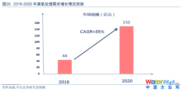 但近年隨著污染惡化、排放提標(biāo),傳統(tǒng)處理工藝已無(wú)法滿足要求。此種情況下,臭氧處理市場(chǎng)不斷發(fā)展,國(guó)產(chǎn)品牌也隨之壯大。2016年,工業(yè)級(jí)市場(chǎng)規(guī)模已達(dá)44億元,2020年預(yù)計(jì)可達(dá)146億元。我們判斷行業(yè)下一階段發(fā)展趨勢(shì)為:1)國(guó)產(chǎn)品質(zhì)升級(jí),進(jìn)軍高端市場(chǎng),替代進(jìn)口品牌; 2)PPP改變終端格局,性價(jià)比高的品牌占據(jù)競(jìng)爭(zhēng)優(yōu)勢(shì);3)資本助力外延并購(gòu),提升市占率、技術(shù)實(shí)力等競(jìng)爭(zhēng)優(yōu)勢(shì);4)低能耗將是技術(shù)突破的最大變量。