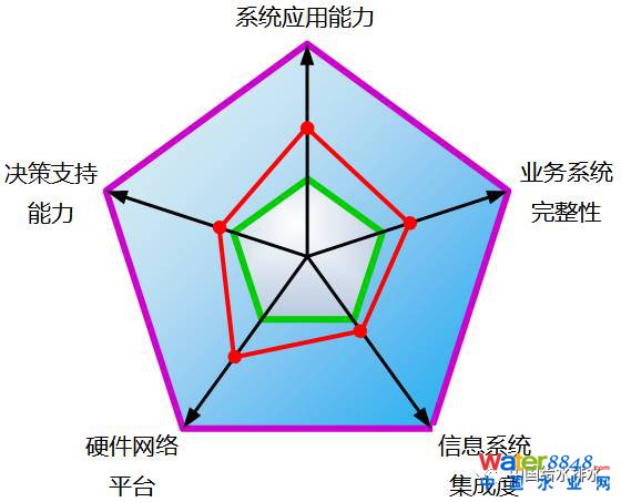 對(duì)于信息系統(tǒng)建設(shè)成熟度的評(píng)價(jià),一般采用五維結(jié)構(gòu)圖來表示,該圖描述了數(shù)字排水的現(xiàn)狀及其智慧排水應(yīng)達(dá)到的目標(biāo)(紅色線代表數(shù)字排水,紫色線代表智慧排水)。因此,要從“數(shù)字排水”到“智慧排水”的過渡和轉(zhuǎn)變,必須從這張五維結(jié)構(gòu)圖上實(shí)現(xiàn)全面的突破和完善。
