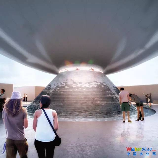 圓球的表面是由透明、發(fā)光的太陽能聚光器組成的,它提供能量給內(nèi)部的水循環(huán),圓球的內(nèi)部有一個(gè)太陽能蒸發(fā)器,它通過蒸發(fā)和冷凝作用來產(chǎn)生淡水。經(jīng)過淡化的水直接倒到底下的噴泉里,這也是對光和水對于生命意義的一次藝術(shù)性的詮釋。