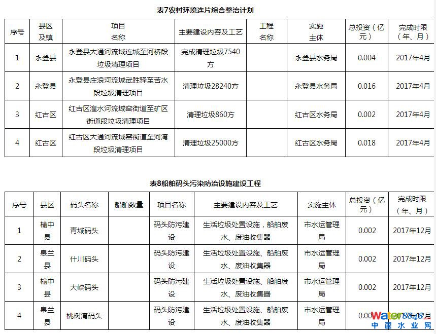 (二)垃圾清理項(xiàng)目。永登縣大通河流域連城至河橋段、莊浪河流域武勝驛至苦水段進(jìn)行垃圾清理,涉及永登縣河橋鎮(zhèn)、武勝驛鎮(zhèn)、中堡鎮(zhèn)、城關(guān)鎮(zhèn)、柳樹(shù)鎮(zhèn)、大同鎮(zhèn)、龍泉寺鎮(zhèn)、紅城鎮(zhèn)、苦水鎮(zhèn)、連城鎮(zhèn)等10個(gè)鎮(zhèn),投資200萬(wàn)元,計(jì)劃于2017年4月底前完成清理工作;紅古區(qū)湟水河流域窯街道至礦區(qū)街道段、大通河流域窯街道至河灣段進(jìn)行垃圾清理,涉及華龍街道、窯街街道、下窯街道、礦區(qū)街道、海石灣鎮(zhèn)、紅古鎮(zhèn)、花莊鎮(zhèn)、平安鎮(zhèn),投資120萬(wàn)元,計(jì)劃于2017年4月底前完成清理工作。