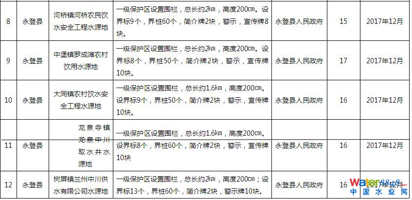 (三)大力推進(jìn)飲用水水源地規(guī)范化建設(shè)工程。組織開(kāi)展榆中縣、七里河區(qū)、皋蘭縣、永登縣轄區(qū)內(nèi)10個(gè)鄉(xiāng)鎮(zhèn)飲用水水源保護(hù)區(qū)規(guī)范化建設(shè)工程。建設(shè)一級(jí)保護(hù)區(qū)防護(hù)圍欄、標(biāo)志牌、警示牌等工程建設(shè),取締排污口,確保飲用水安全。