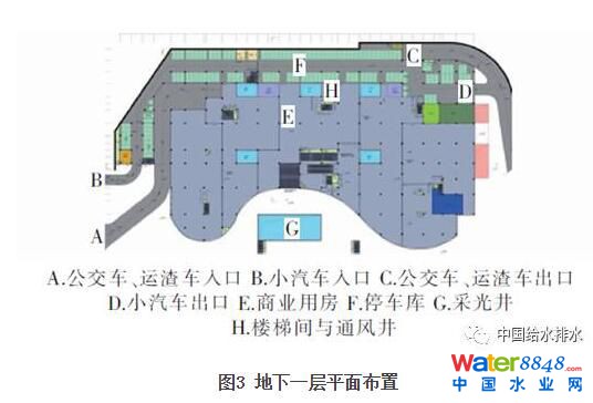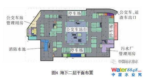 該地塊地面公園面積3.94ha,地下綜合體總建筑面積為65325.95平方米。其中地下一層為商業(yè)用房和機(jī)械停車庫(kù),商業(yè)用房建筑面積為11201.59平方米、機(jī)械停車庫(kù)建筑面積為4397.6平方米;地下二層為公交首末站及其附屬用房,建筑面積為21320.17平方米;地下三、四層為污水處理廠,建筑面積為28406.59平方米(包括設(shè)在地下二層綜合辦公用房)。