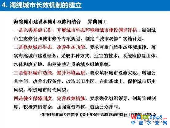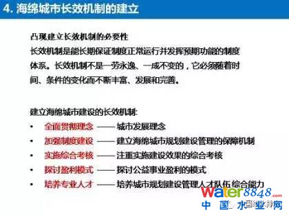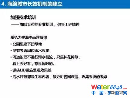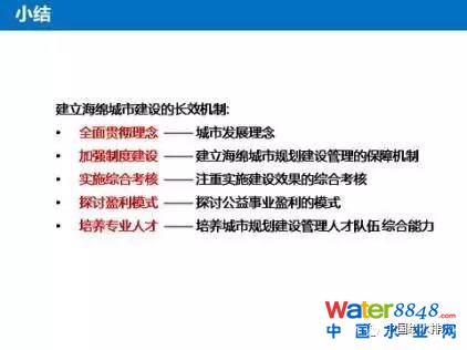 總結(jié)起來,建設(shè)海綿城市長效機(jī)制,一個是理念方面,一個是制度保證方面,一個是實(shí)行綜合考核,不管是對干部還是對項(xiàng)目,再有探討新的盈利模式,加強(qiáng)人才隊(duì)伍的培訓(xùn)。如果是這樣,海綿城市能夠比較健康得發(fā)展下去。