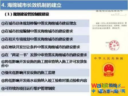 制度保證方面。在法律層面通過條例還是通過地方立法,要有法律方面的制度設(shè)計(jì),要有制度的建立。再比如標(biāo)準(zhǔn),通過標(biāo)準(zhǔn)和地方的管理規(guī)定,一樣能夠使這個事情長期堅(jiān)持下去。這也是海綿城市一開始建設(shè)就提到了,要加強(qiáng)規(guī)劃管控。包括現(xiàn)在的考核也要檢查制度建設(shè)的情況,有的城市這方面會吃虧,制度方面什么也沒有寫,什么也沒有填。在土地開發(fā)的過程中還是在規(guī)劃審批中,還是設(shè)置什么條件中要有所體現(xiàn),這樣才能堅(jiān)持下去。包括藍(lán)綠線和其他的制度,以及必要的技術(shù)導(dǎo)則,包括規(guī)劃設(shè)計(jì)、管理、施工。很多城市在這方面做了好多工作,只要有制度保證才能堅(jiān)持下去。