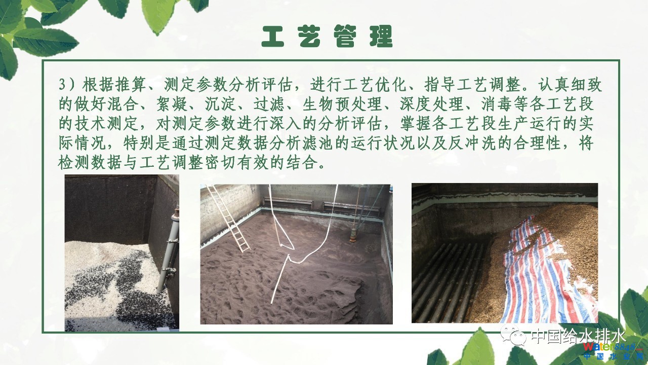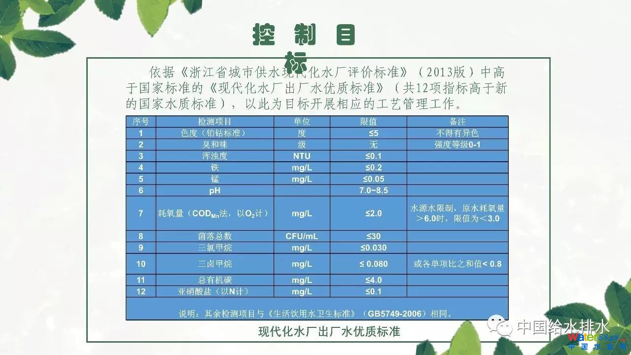 運(yùn)河水廠就地取用河網(wǎng)水源(京杭運(yùn)河),從對(duì)源水的監(jiān)測(cè)情況來看,有機(jī)污染比較嚴(yán)重,屬于微污染水源,原水水質(zhì)多項(xiàng)指標(biāo)不符合《地表水環(huán)境質(zhì)量標(biāo)準(zhǔn)》(GB3838-2002)的相關(guān)要求,總體水質(zhì)以IV~V為主。凈水工藝采用生物預(yù)處理+強(qiáng)化常規(guī)處理+臭氧活性炭深度處理工藝。報(bào)告詳細(xì)介紹了運(yùn)河水廠在工藝管理方面的一些措施,例如不斷完善工藝管理手冊(cè),工藝管理手冊(cè)內(nèi)容涵蓋水廠概況、工藝管理、檢測(cè)方法、工藝原理、工藝調(diào)整、水質(zhì)標(biāo)準(zhǔn)及規(guī)范等七個(gè)方面;選擇適合的藥劑品種開展小試;工藝設(shè)施按要求巡查及維護(hù);工藝參數(shù)的技術(shù)測(cè)定與分析評(píng)估,掌握各單體生產(chǎn)運(yùn)行的實(shí)際情況,通過測(cè)定數(shù)據(jù)分析運(yùn)行狀況是否合理;優(yōu)化內(nèi)控標(biāo)準(zhǔn),嚴(yán)格控制水質(zhì),制定有針對(duì)性的各工藝單元內(nèi)控標(biāo)準(zhǔn)等。