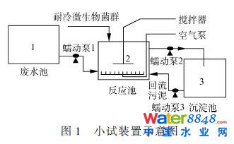耐冷活性污泥污水處理能力評價自制小試裝置如圖1 所示,包括1 個空氣泵,3 個蠕動泵,體積均為4 L 的廢水池(裝人工污水)、反應(yīng)池(裝活性污泥并進(jìn)行曝氣) 和沉淀池(裝處理后的污水并可回流污泥)各1 個。