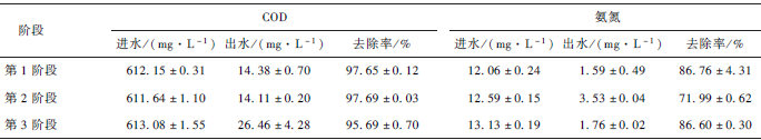 由表5 可知,達(dá)到穩(wěn)定時1 至2 階段的COD 去除率都維持在97% 左右,第3 階段維持在95% 左右;而氨氮的去除率除了在第2 階段時只有72% 左右以外,第1 和第3 階段都達(dá)到了86% 以上。