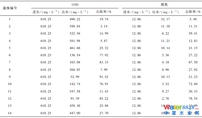 將分離出的14 種單菌株通過測定其5 ℃ 條件下的COD 和氨氮去除率來篩選目標(biāo)菌株,表3 為處理5d 后的COD 和氨氮測定結(jié)果,綜合各菌株的COD 和氨氮的去除率可篩選出6 種優(yōu)勢菌株,即3 號、6 號、7號、9 號、10 號和12 號菌株。