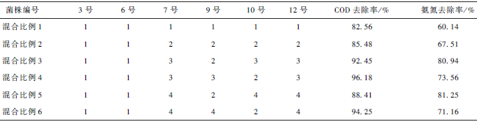 將篩選出來的6 種優(yōu)勢菌株按照表4 所列的6 種比例混合,測定其5 ℃ 條件下的COD 和氨氮去除率,表中列出了5 d 后各混合菌處理人工污水的COD 和氨氮去除率。實驗結(jié)果顯示混合比例3 和混合比例5 可同時保證COD 和氨氮的去除率都相對較高,本實驗最終依據(jù)混合比例3 進(jìn)行菌株混合,然后將混合菌轉(zhuǎn)入人工污水培養(yǎng)以便后續(xù)實驗。