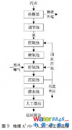 地埋A2/O-人工濕地技術(shù):A2/O 工藝亦稱A-A-O 工藝,本工藝為采用厭氧—缺氧—好氧法生物脫氮除磷工藝的簡稱,是流程最簡單,應(yīng)用最廣泛的脫氮除磷工藝。適用于處理要求較高,四季氣候變化大,氣溫較低的地區(qū)。處理規(guī)模不小于200 噸/天。工藝參數(shù): 厭氧池停留時間不小于2 h,缺氧池停留時間不小于4 h,好氧池停留時間不小于6 h,人工濕地水力負荷0. 5~1. 0 m3/(m2·d) ,污泥理周期180 天,工藝流程見圖9。