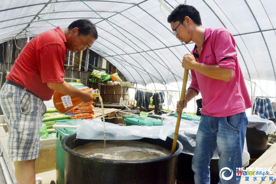 •   7月27日,浙江海洋大學(xué)工作人員正在舟山市定海區(qū)小展生產(chǎn)基地,用池塘底層污泥制作凈水劑。近年來,該大學(xué)水產(chǎn)學(xué)院儲(chǔ)張杰教授研究團(tuán)隊(duì)在池塘污泥中分離出185種菌株,通過上千次試驗(yàn),篩選出高效降解污水中氮磷的芽孢桿菌菌種,通過擴(kuò)大培養(yǎng),目前已制作微生物菌劑5000多公斤,該菌劑來源于池塘底泥,具有凈水效果好、凈水速度快,不產(chǎn)生二次污染等特點(diǎn),為水產(chǎn)養(yǎng)殖污水處理與河道污水處理提供了新的途徑。(浙江在線拍友 胡社友 攝)