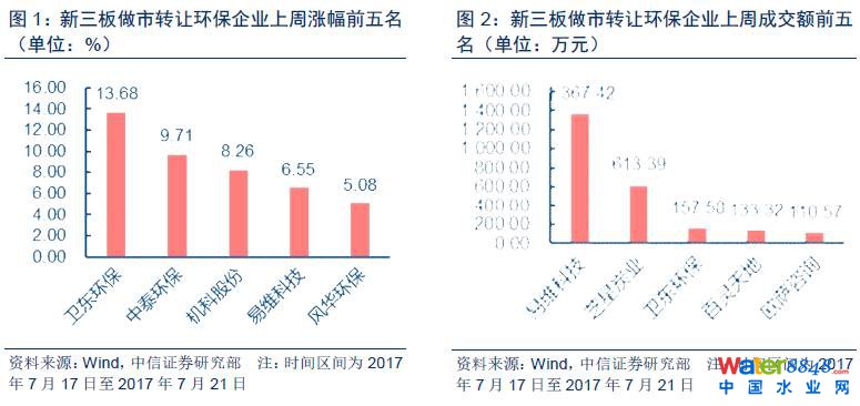 新三板環(huán)保行業(yè)做市和協(xié)議轉(zhuǎn)讓板塊回顧。截至2017年7月21日,新三板環(huán)保板塊共有485家公司。上周(2017年7月17日至2017年7月21日),485家公司新三板環(huán)保公司中,有94家發(fā)生交易。(1)做市轉(zhuǎn)讓板塊,83家公司構(gòu)成的做市板塊中有45家發(fā)生交易。漲幅方面,板塊共有17家公司股票上漲,衛(wèi)東環(huán)保(832043.OC)漲幅13.68%,領(lǐng)跑整個(gè)板塊。成交額方面,成交額前三位的公司為易維科技(430261.OC,1367.42萬元)、芝星炭業(yè)(832740.OC,613.39萬元)、衛(wèi)東環(huán)保(832043.OC,157.58萬元)。(2)協(xié)議轉(zhuǎn)讓板塊,402家公司構(gòu)成的協(xié)議板塊中有49家發(fā)生交易。漲幅方面,共有23只股票上漲,其中益諾歐(839748.OC)漲幅700.00%,為整個(gè)板塊最高。成交額方面,成交額前三位的公司分別為仕凈環(huán)保(835710.OC,4257.4萬元)、金利股份(832081.OC,1636.60萬元)、亞洲生態(tài)(836806.OC,1555.20萬元)。