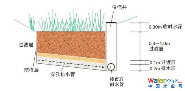 過濾層不可或缺,主要作用包括去除污染物和為植物提供營養(yǎng)等。植物能夠加強過濾,使過濾層不板結,還能夠去除部分污染物。過濾層應有足夠的深度使植物正常生長,深度一般為600—1000mm,在深度控制區(qū),最小深度可取300mm。如果植物中含有深根植物,則過濾層深度應大于800mm,以免生物滯留池被植物根破壞。