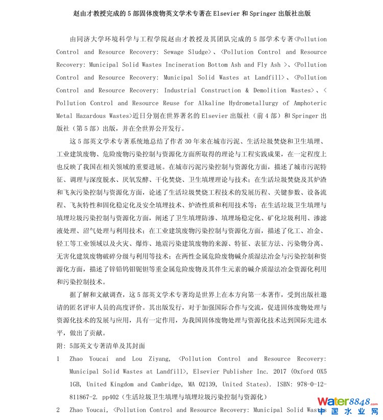 趙由才教授完成的5部固體廢物英文學(xué)術(shù)專著在ElsevierSpringer出版社出版