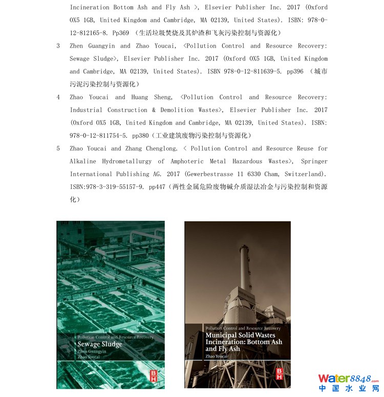 2            Zhao Youcai, , Elsevier Publisher Inc. 2017 (Oxford OX5 1GB, United Kingdom and Cambridge, MA 02139, United States). ISBN: 978-0-12-812165-8. Pp369 (生活垃圾焚燒及其爐渣和飛灰污染控制與資源化)