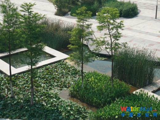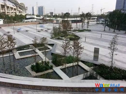 ③廣場(chǎng)的硬質(zhì)鋪裝也可設(shè)置雨水濕地或地下式蓄水池,用來收集周邊硬質(zhì)鋪裝的雨水徑流,凈化后可用于綠化澆灌、鋪裝沖洗。