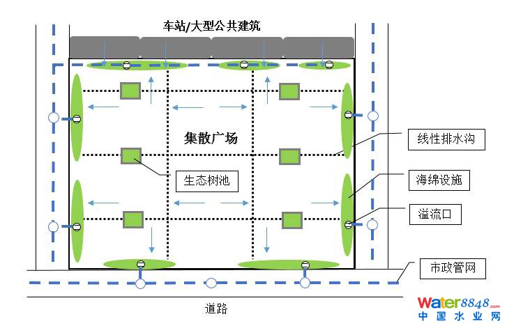 ③集散廣場(chǎng)一般以硬質(zhì)鋪裝為主,宜采用透水鋪裝,同時(shí)設(shè)置線性排水溝或植草溝,雨水徑流通過有組織的匯流與轉(zhuǎn)輸,引入周邊綠地海綿設(shè)施。