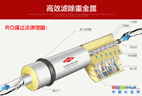 反滲透(RO):1960年 Loeb和Souriringan首次研制成世界上具有歷史意義的非對(duì)稱反滲透膜,這在膜分離技術(shù)發(fā)展中是一個(gè)重要的突破,使膜分離技術(shù)進(jìn)入了大規(guī)模工業(yè)化應(yīng)用的時(shí)代。過(guò)濾精度為0.0001微米左右,是美國(guó)60年代初研制的一種超高精度的利用壓差的膜法分離技術(shù)?蔀V除水中的幾乎一切的雜質(zhì)(包括有害的和有益的),只能允許水分子通過(guò)。也就是說(shuō)用反滲膜制水的過(guò)程中,一定會(huì)浪費(fèi)將近50%以上的自來(lái)水。這是一般家庭不能接受的。一般用于純凈水、工業(yè)超純水、醫(yī)藥超純水的制造。反滲透技術(shù)需要加壓、加電,流量小,水的利用率低,不適合大量生活飲用水的凈化。