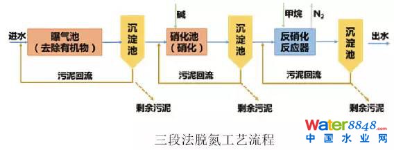 1969年,美國(guó)的Barth提出采用三段法除氮,第一段是好氧段,主要去除有機(jī)物,第二段加堿硝化,第三段是厭氧反硝化,除氮。