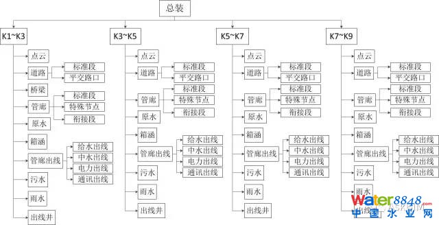 本次建模針對(duì)道路工程、原水工程、綜合管廊工程、廊內(nèi)管線出線(電力、通訊、中水、給水、廊內(nèi)集水池)、橋涵工程、雨水工程、污水工程。針對(duì)綜合管廊的節(jié)點(diǎn)進(jìn)行建模(廊內(nèi)管線、預(yù)留預(yù)埋、消防、支吊架、支墩、廊內(nèi)排水),建模范圍K1+774~K9+424.4。
