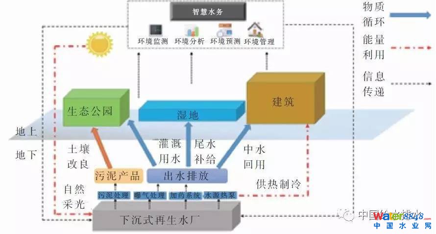 通過(guò)下沉式再生水廠以及地上空間內(nèi)濕地、科普基地和人文景觀等建設(shè),構(gòu)建了碧水生態(tài)綜合體的物質(zhì)循環(huán)、能量利用和信息傳遞,不僅有效利用了下沉式再生水廠高品質(zhì)出水、污泥和能源產(chǎn)出,并且與周邊居住、工商業(yè)和旅游功能區(qū)互補(bǔ),實(shí)現(xiàn)環(huán)境友好型、土地節(jié)約型、資源利用型的城市新型再生水廠建設(shè)。