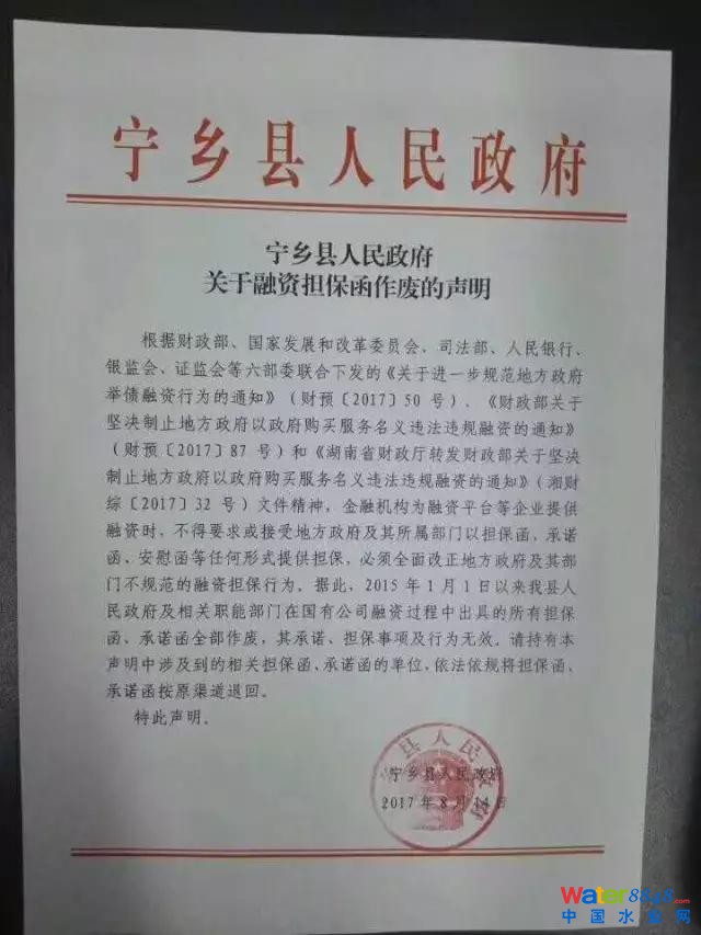 今天(8月23日),網(wǎng)上流傳一份寧鄉(xiāng)縣人民政府關(guān)于融資擔保函作廢的聲明刷屏朋友圈,與以往撤函不同的是,這次地方政府撤函顯得簡單粗暴,直接宣布所有擔保函、承諾函全部作廢。《華夏時報》記者從與相關(guān)機構(gòu)處證實了此函的真實性。