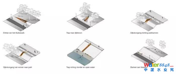 當(dāng)有過多的雨水時(shí),這些滲透區(qū)會(huì)成為一個(gè)開放的水渠,引導(dǎo)雨水進(jìn)入排水管中。人們運(yùn)作水車,將一邊水池的水抽到另一個(gè)水池中,然后進(jìn)入到Lovaart。