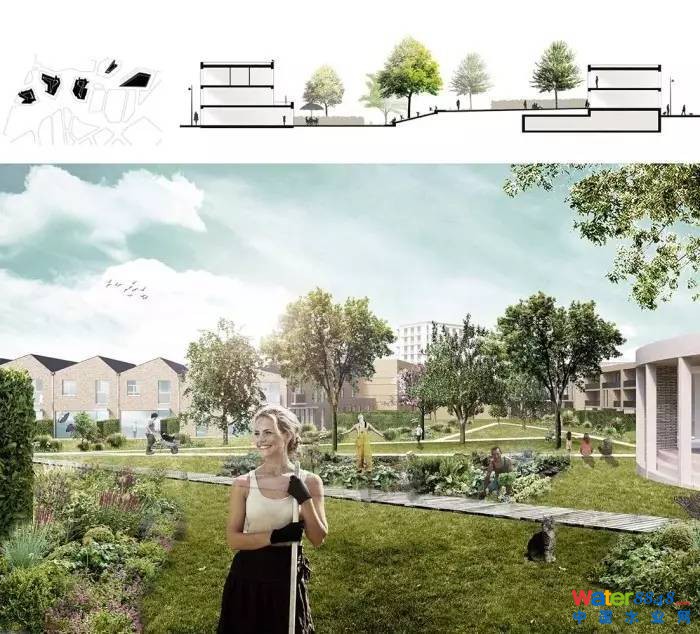 這個(gè)方案很具靈活性,尋找水、材料、能源和食物使用的平衡以及如何滿足未來居民和周邊城市需求的答案。綠色屋頂確保少量的熱損耗。另外,綠色屋頂幫助緩沖和放緩雨水排放。水也能儲(chǔ)存到住宅中,再次使用。
