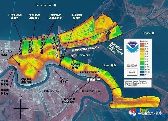 Katrina颶風對新奧爾良市供、排水和污水處理系統(tǒng)的影響及其啟示 新奧爾良市受災情況圖(根據(jù)美國陸軍工程兵資料編輯)