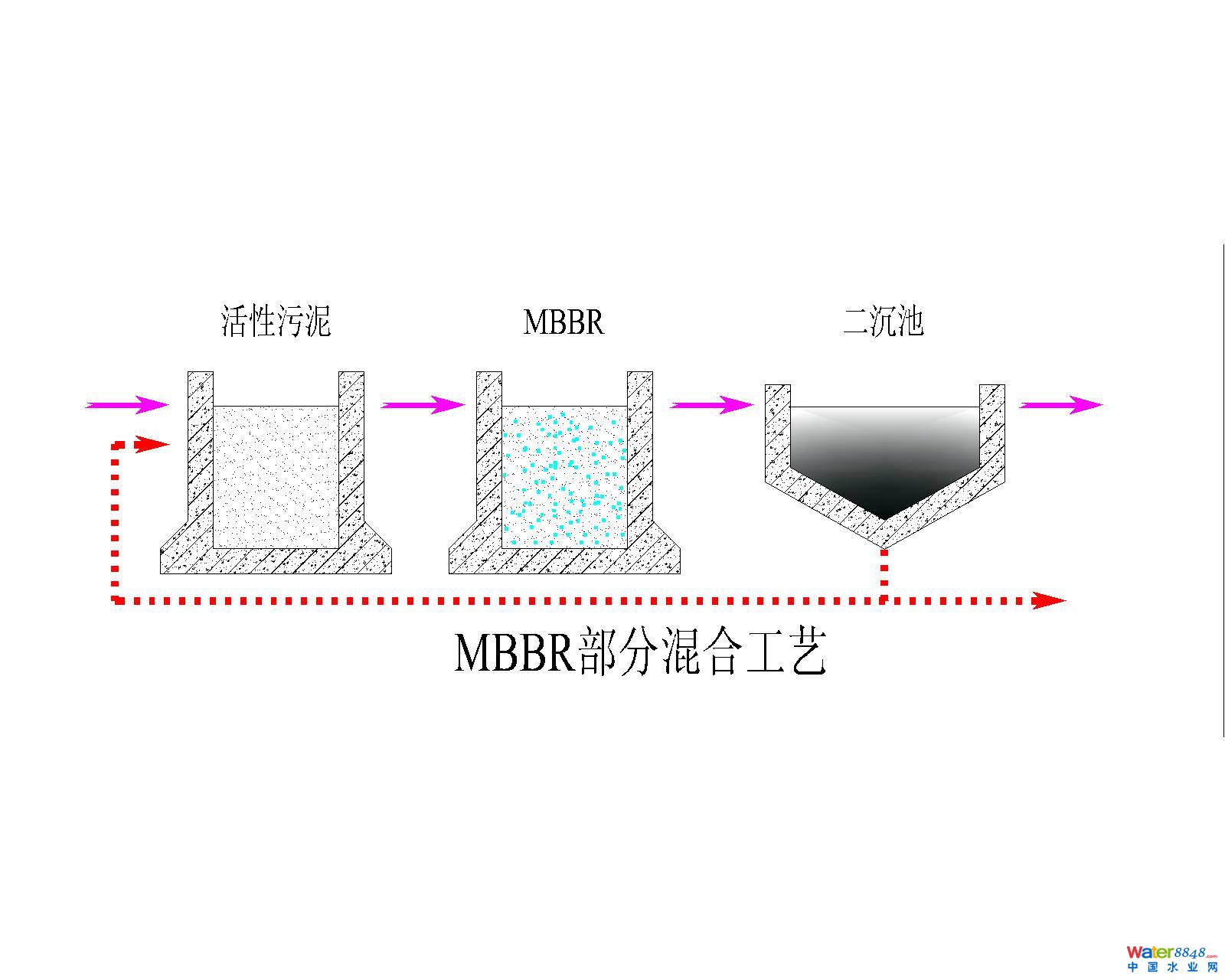 MBBR與活性污泥混合工藝,可提高處理能力50%以上并達(dá)到脫氮除磷的目標(biāo)?稍诓辉黾映厝莸臈l件下,與A2/O、氧化溝、SBR等多項(xiàng)工藝結(jié)合。
