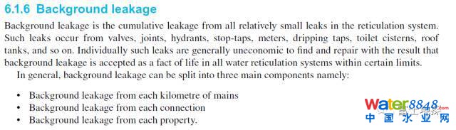 同時(shí)“漏損標(biāo)準(zhǔn)”中還增添了背景漏失(background leakage)這個(gè)術(shù)語,解釋為:“現(xiàn)有技術(shù)手段和措施未能檢測(cè)到的管網(wǎng)漏點(diǎn)的漏失水量。”本術(shù)語源自于1992-94年 Allan Lambert 先生在英國國家漏損控制大會(huì)上為計(jì)算漏失水量而提出的概念。從通俗的角度講,背景漏失就是我們已知在檢漏過程中無法察覺到的物理滲漏,個(gè)人認(rèn)為從background直譯為“背景”二字還是有失偏頗,因?yàn)檫@種滲漏性質(zhì)的漏點(diǎn)和供水管網(wǎng)的大背景其實(shí)并沒有太大的關(guān)系。事實(shí)上,國際水協(xié)出版社出版的《Water Management and Water Loss》這部著作中對(duì)background leakage做出了如下的定義(參加圖三)。