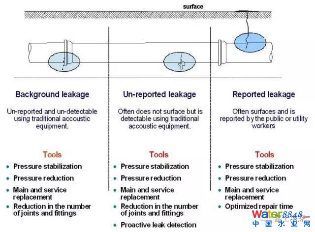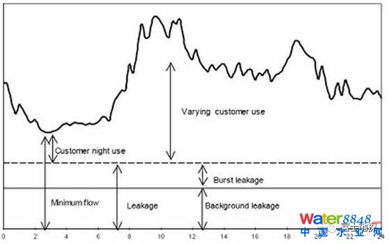 通過翻譯文中內(nèi)容,我們可以知道背景漏失,是一套供水管網(wǎng)系統(tǒng)中所有相對(duì)小型漏點(diǎn)的累計(jì)漏失量。這些漏點(diǎn)來自于閥門、接口、消火栓、水表、水龍頭、馬桶水箱、樓頂水箱等。這些漏點(diǎn)從探測(cè)的經(jīng)濟(jì)性和維修價(jià)值上講都是無效的,因此行業(yè)普遍接受這種事實(shí)存在所有供水管網(wǎng)中的漏點(diǎn)類型。一般背景漏失還可進(jìn)一步分為三個(gè)部分: