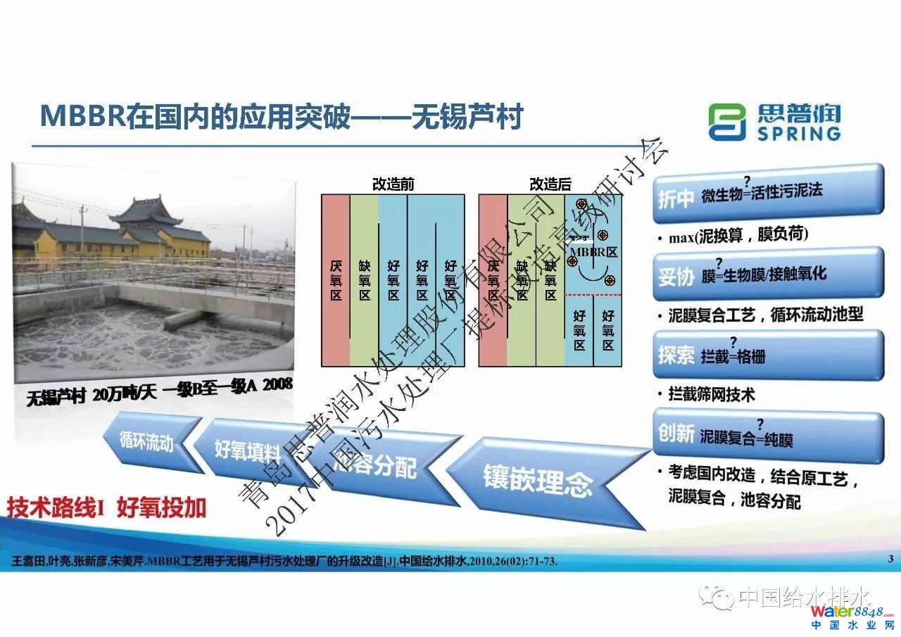 今天很榮幸有這個(gè)機(jī)會(huì)跟各位專家一起分享一下MBBR近十年的發(fā)展和應(yīng)用。這個(gè)技術(shù)起源挪威,上世紀(jì)90年代主要在歐美國家發(fā)展應(yīng)用,當(dāng)時(shí)在世界范圍內(nèi)已經(jīng)有50多個(gè)國家、300多座污水廠應(yīng)用此工藝技術(shù)。MBBR技術(shù)于2000年初引入國內(nèi),引入初期出現(xiàn)一些失敗案例,這也延緩了這個(gè)工藝在國內(nèi)的推廣發(fā)展。初期失敗的主要原因是把MBBR的微生物膜和傳統(tǒng)的活性污泥法的懸浮性微生物等同起來。忽視了MBBR生物膜的特點(diǎn),比如填料流化的重要性、篩網(wǎng)攔截、填料堆堵等問題,另外沒有跟國內(nèi)實(shí)際情況相結(jié)合也是導(dǎo)致出現(xiàn)這些問題原因。直到2008年無錫蘆村首次將MBBR成功用于大型污水廠,這一個(gè)技術(shù)才真正在國內(nèi)開啟了工程化應(yīng)用的先河。這是因?yàn)閷?duì)上述MBBR出現(xiàn)的問題有了科學(xué)的認(rèn)知,采取了一些折中和妥協(xié)辦法,探索了一些創(chuàng)新技術(shù),凝練了延用至今升級(jí)改造路線——以鑲嵌理念,進(jìn)行重新分配,優(yōu)先滿足好氧區(qū)不足的部分,通過添加填料予以補(bǔ)足,采用循環(huán)流動(dòng)池型等等。