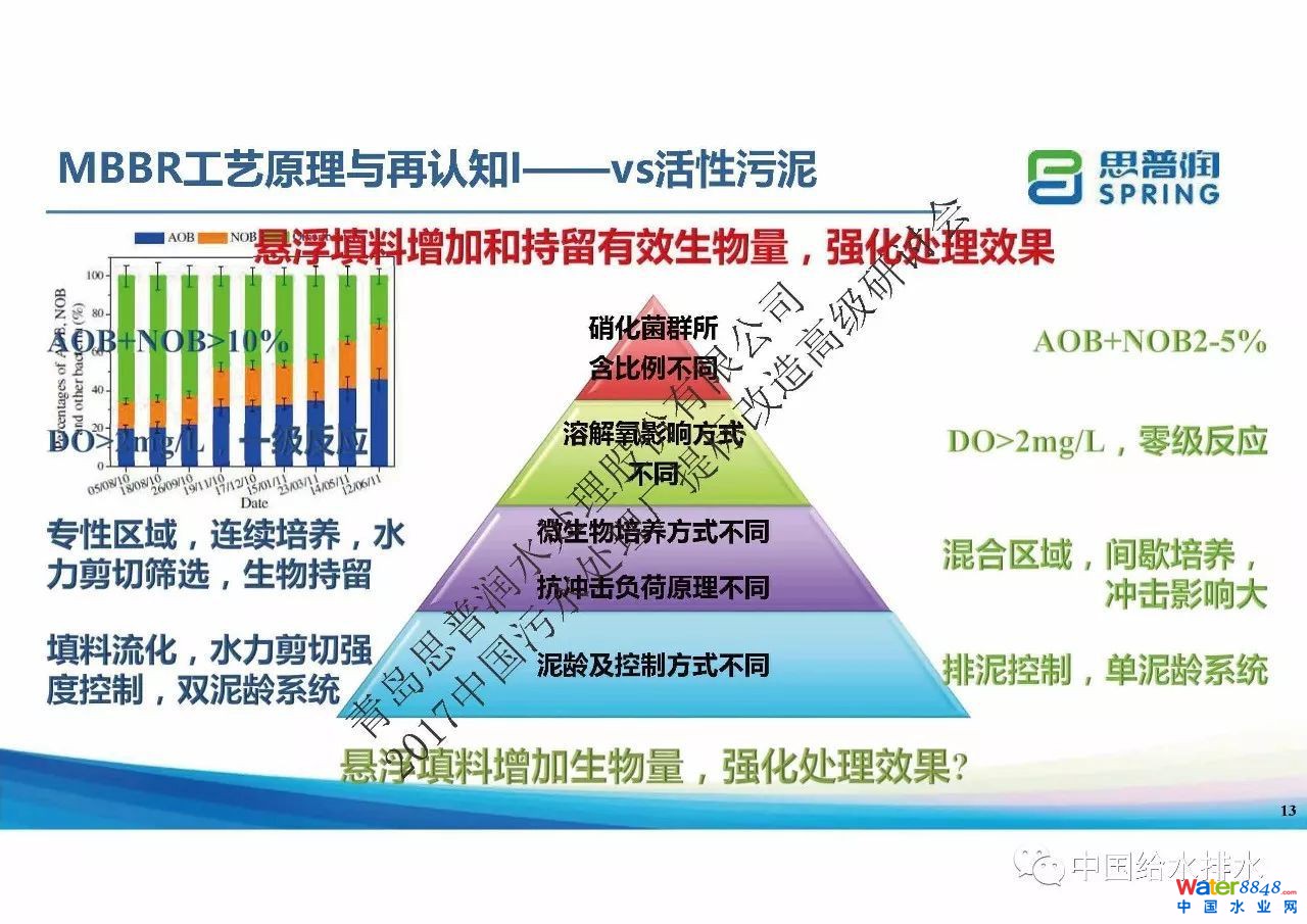 第二個(gè)是介紹MBBR的工藝原理與再認(rèn)知。我們一想到生化工藝,最初想到的就是活性污泥法,此技術(shù)已經(jīng)發(fā)展百年,所以我們總習(xí)慣拿活性污泥法跟MBBR工藝作比較。實(shí)際它跟活性污泥法有聯(lián)系也有區(qū)別。首先說聯(lián)系方面,它們的動(dòng)力來源相同,好氧階段都是通過爆氣實(shí)現(xiàn),MBBR技術(shù)的泥膜負(fù)荷工藝有污泥回流,運(yùn)行方式、工藝布置流程相似。再說區(qū)別方面,傳統(tǒng)活性污泥法由于通過剩余污泥排放控制泥齡,是一個(gè)單泥齡系統(tǒng);MBBR工藝是一個(gè)雙泥齡的系統(tǒng),有固定態(tài)泥齡也有懸浮態(tài)泥齡,一定程度可以緩解脫氮除磷泥齡上面矛盾。傳統(tǒng)的活性污泥法微生物是階段培養(yǎng),比如硝化菌群在好氧曝氣階段實(shí)現(xiàn)增殖恢復(fù),在缺氧段又受到抑制;而MBBR是一個(gè)專性和連續(xù)的培養(yǎng)過程,生物膜在固定區(qū)域流化培養(yǎng)。MBBR工藝中的微生物固定在填料上,強(qiáng)沖擊來臨時(shí),整個(gè)的菌群系統(tǒng)不受影響,沖擊過后整個(gè)系統(tǒng)的效能能很快恢復(fù)。再一個(gè)就是溶解氧不同,傳統(tǒng)的活性污泥法在溶解氧大于2毫克/L時(shí)硝化功能就不受溶解氧影響,此時(shí)是一個(gè)零級(jí)反應(yīng);而MBBR工藝可以看到隨著溶解氧的增加有兩個(gè)明顯區(qū)域,不同溶解氧水平下不光有零級(jí)反應(yīng),也有一級(jí)反應(yīng)的區(qū)間。綜上所述我們認(rèn)為懸浮填料MBBR工藝泥齡控制方式和活性污泥法不同,抗沖擊原理不同,微生物培養(yǎng)方式不同,溶解氧傳質(zhì)的方式不同,硝化菌群所含的比例不同,硝化菌群比例一般大于10%,最多可以超過70%。所以我們認(rèn)為懸浮填料是增加和持留有效生物量、強(qiáng)化處理效果,而不僅僅是認(rèn)為就是增加了MLSS。